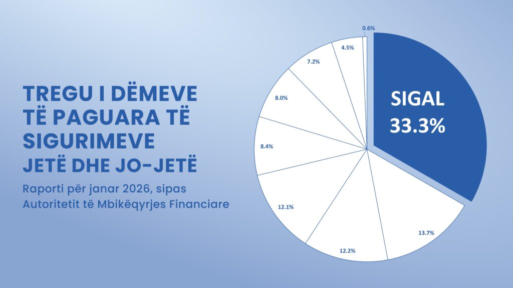 Sipas raportit zyrtar të Autoritetit të Mbikëqyrjes Financiare, për muajin janar 2026, SIGAL Insurance Group paguan 33.32% të dëmeve totale të industrisë siguruese në vend.