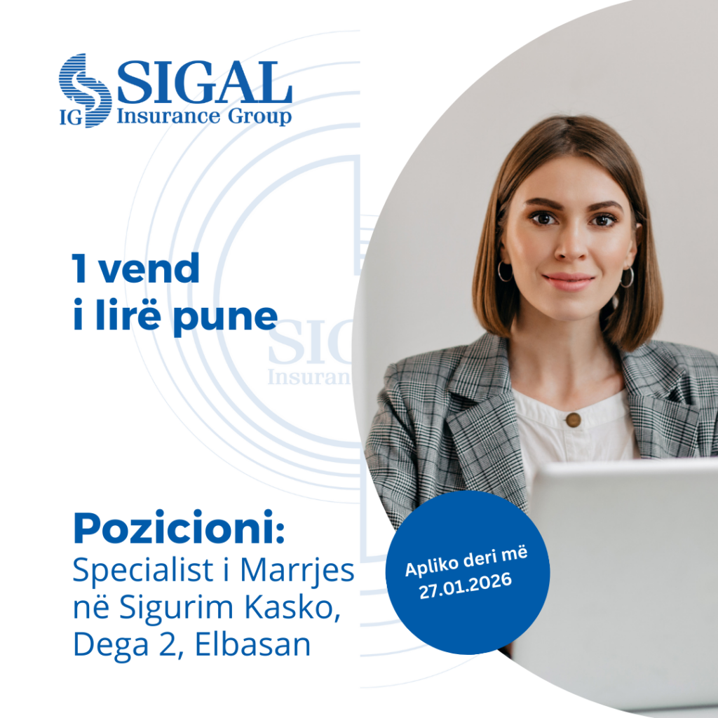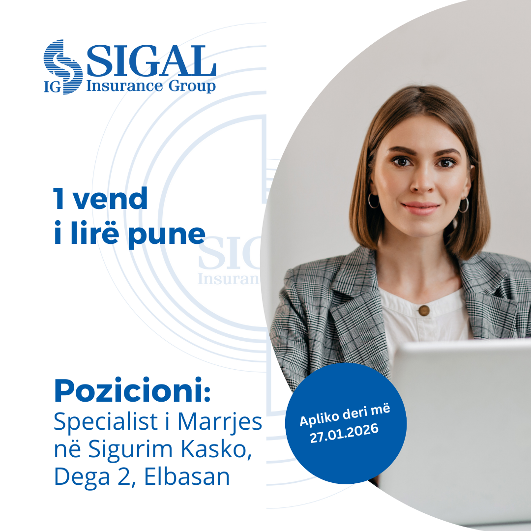 “SIGAL INSURANCE GROUP” sh.a. shoqëri sigurimi me eksperiencë 26 vjeçare, themeluar më 22 Shkurt 1999, e përfaqësuar me 8 kompani sigurimi jetë dhe jo-jetë, risigurime dhe fond pensionesh që ofron të gjitha klasat e sigurimit me 42 produkte, me rreth 1,500 punonjës dhe agjentë në mbi 900 zyra ku ajo operon dhe zhvillon aktivitetin e saj në 3 shtete: Shqipëri, Kosovë dhe Maqedoninë e Veriut, shpall 1 (një) vend të lirë pune për: