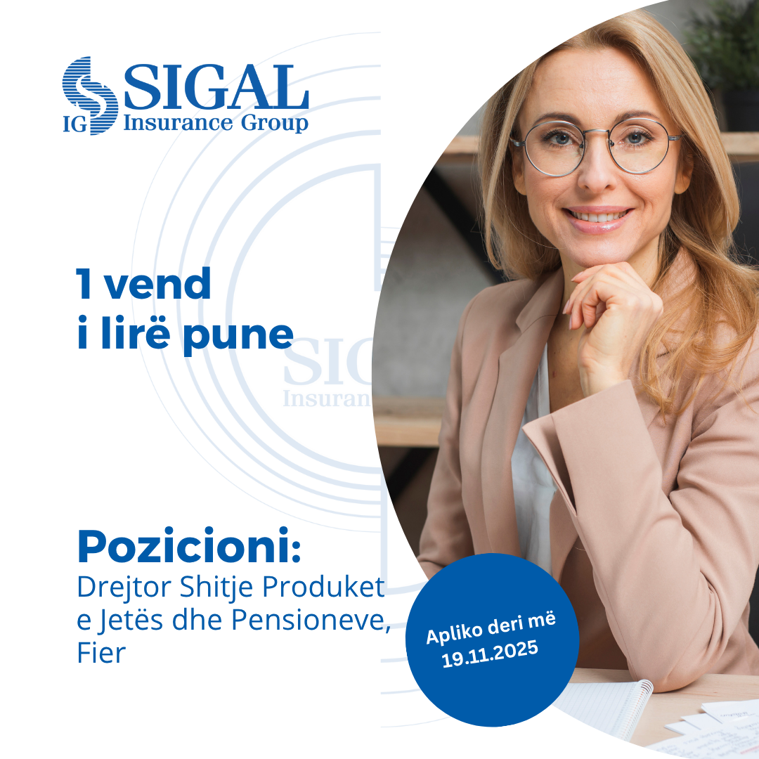 “SIGAL INSURANCE GROUP” sh.a. shoqëri sigurimi me eksperiencë 26 vjeçare, themeluar më 22 Shkurt 1999, e përfaqësuar me 8 kompani sigurimi jetë dhe jo-jetë, risigurime dhe fond pensionesh që ofron të gjitha klasat e sigurimit me 42 produkte, me rreth 1,500 punonjës dhe agjentë në mbi 900 zyra ku ajo operon dhe zhvillon aktivitetin e saj në 3 shtete: Shqipëri, Kosovë dhe Maqedoninë e Veriut, shpall 1 (një) vend të lirë pune për: