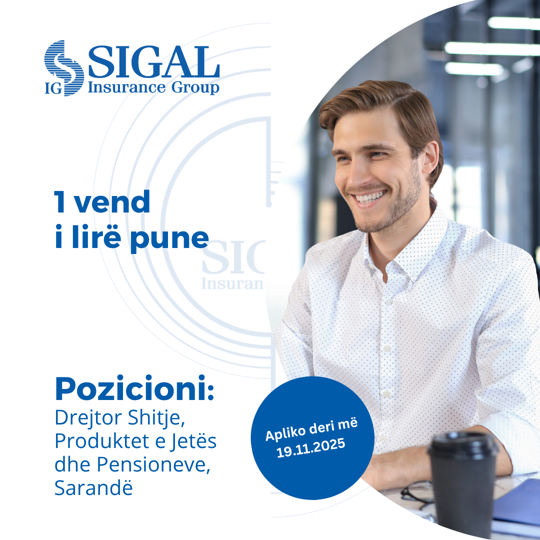 “SIGAL INSURANCE GROUP” sh.a. shoqëri sigurimi me eksperiencë 26 vjeçare, themeluar më 22 Shkurt 1999, e përfaqësuar me 8 kompani sigurimi jetë dhe jo-jetë, risigurime dhe fond pensionesh që ofron të gjitha klasat e sigurimit me 42 produkte, me rreth 1,500 punonjës dhe agjentë në mbi 900 zyra ku ajo operon dhe zhvillon aktivitetin e saj në 3 shtete: Shqipëri, Kosovë dhe Maqedoninë e Veriut, shpall 1 (një) vend të lirë pune për: