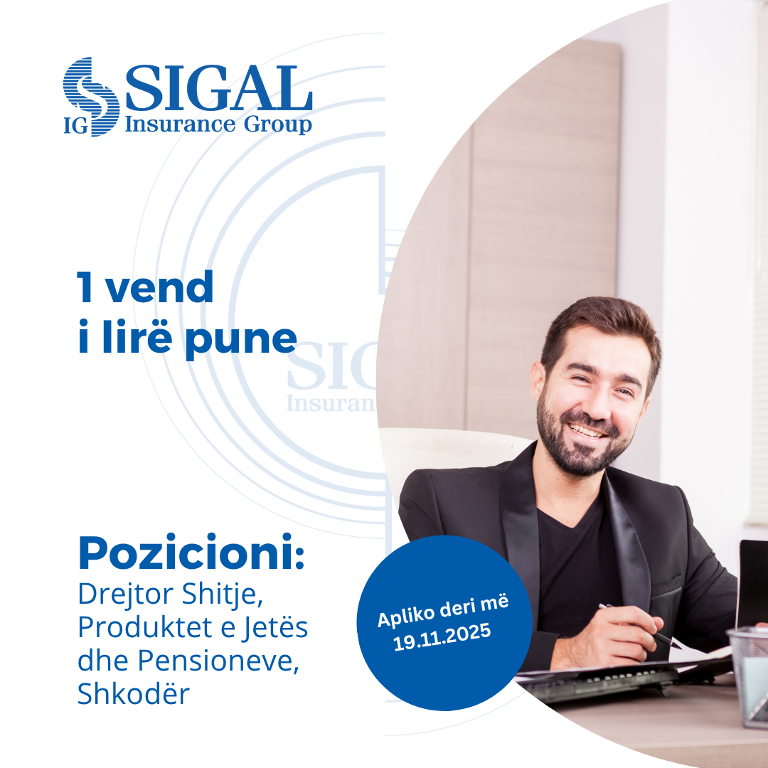 “SIGAL INSURANCE GROUP” sh.a. shoqëri sigurimi me eksperiencë 26 vjeçare, themeluar më 22 Shkurt 1999, e përfaqësuar me 8 kompani sigurimi jetë dhe jo-jetë, risigurime dhe fond pensionesh që ofron të gjitha klasat e sigurimit me 42 produkte, me rreth 1,500 punonjës dhe agjentë në mbi 900 zyra ku ajo operon dhe zhvillon aktivitetin e saj në 3 shtete: Shqipëri, Kosovë dhe Maqedoninë e Veriut, shpall 1 (një) vend të lirë pune për:
