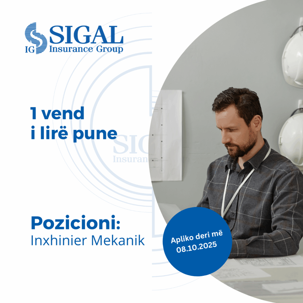 “SIGAL INSURANCE GROUP” sh.a. shoqëri sigurimi me eksperiencë 26 vjeçare, themeluar më 22 Shkurt 1999, e përfaqësuar me 8 kompani sigurimi jetë dhe jo-jetë, risigurime dhe fond pensionesh që ofron të gjitha klasat e sigurimit me 42 produkte, me rreth 1,500 punonjës dhe agjentë në mbi 900 zyra ku ajo operon dhe zhvillon aktivitetin e saj në 3 shtete: Shqipëri, Kosovë dhe Maqedoninë e Veriut, shpall 1 (një) vend të lirë pune për: