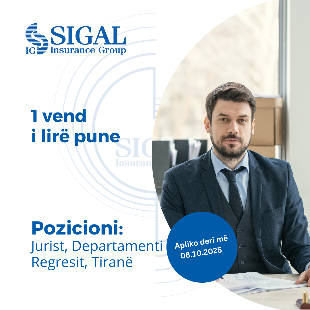 “SIGAL INSURANCE GROUP” sh.a. shoqëri sigurimi me eksperiencë 26 vjeçare, themeluar më 22 Shkurt 1999, e përfaqësuar me 8 kompani sigurimi jetë dhe jo-jetë, risigurime dhe fond pensionesh që ofron të gjitha klasat e sigurimit me 42 produkte, me rreth 1,500 punonjës dhe agjentë në mbi 900 zyra ku ajo operon dhe zhvillon aktivitetin e saj në 3 shtete: Shqipëri, Kosovë dhe Maqedoninë e Veriut, shpall 1 (një) vend të lirë pune për:
