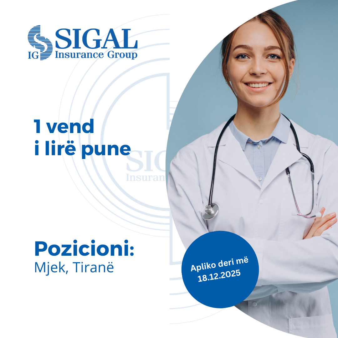 “SIGAL INSURANCE GROUP” sh.a. shoqëri sigurimi me eksperiencë 26 vjeçare, themeluar më 22 Shkurt 1999, e përfaqësuar me 8 kompani sigurimi jetë dhe jo-jetë, risigurime dhe fond pensionesh që ofron të gjitha klasat e sigurimit me 42 produkte, me rreth 1,500 punonjës dhe agjentë në mbi 900 zyra ku ajo operon dhe zhvillon aktivitetin e saj në 3 shtete: Shqipëri, Kosovë dhe Maqedoninë e Veriut, shpall 1 (një) vend të lirë pune për: